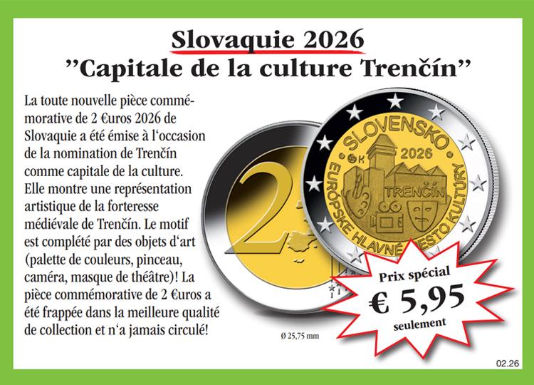 Panier Vous n'avez pas encore d'article dans votre panier. La première pièce de 2 euros de Slovaquie de 2009! Assurez-vous dès aujourd'hui la première pièce de 2 euros de Slovaquie de 2009, en qualité collection neuve au prix spécial de seulement € 6,95 et à rythme mensuel d'autres émissions de cette collection à l'examen et sans obligation d'achat. Vous disposez à chaque livraison d'un droit de restitution de 15 jours! 6,95 € TVA légale incluse Quantité: Participation aux frais d'envoi en sus (port, emballage, assurance) Ce produit ne peut être commandé que 5 fois par client. En cas de question, contactez notre service clientèle. Cela pourrait aussi vous intéresser!