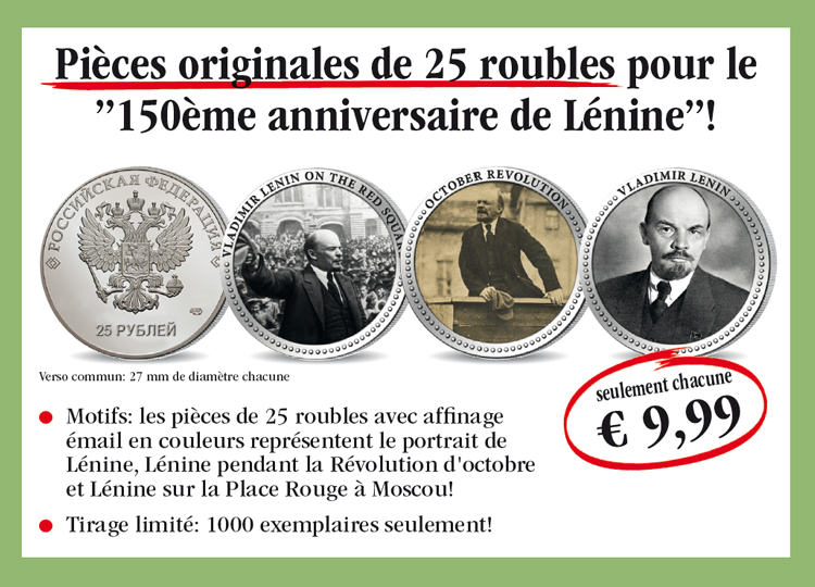 Panier Vous n'avez pas encore d'article dans votre panier. La pièce originale de 25 roubles „Lénine sur la Place Rouge“ avec affinage émail en couleurs! Procurez-vous dès aujourd'hui la pièce originale de 25 roubles „Lénine sur la Place Rouge“ avec affinage émail en couleurs au prix spécial de seulement € 9,99! Vous avez à chaque livraison un droit de restitution de 15 jours! 9,99 € TVA légale incluse Quantité: Participation aux frais d'envoi en sus (port, emballage, assurance) Ce produit ne peut être commandé que 5 fois par client. En cas de question, contactez notre service clientèle. La pièce originale de 25 roubles „Révolution d'octobre“ avec affinage émail en couleurs! Procurez-vous dès aujourd'hui la pièce originale de 25 roubles „Révolution d'octobre“ avec affinage émail en couleurs au prix spécial de seulement € 9,99! Vous avez à chaque livraison un droit de restitution de 15 jours! 9,99 € TVA légale incluse Quantité: Participation aux frais d'envoi en sus (port, emballage, assurance) Ce produit ne peut être commandé que 5 fois par client. En cas de question, contactez notre service clientèle. La pièce originale de 25 roubles „Vladimir Lénine“ avec affinage émail en couleurs! Procurez-vous dès aujourd'hui la pièce originale de 25 roubles „Vladimir Lénine“ avec affinage émail en couleurs au prix spécial de seulement € 9,99! Vous avez à chaque livraison un droit de restitution de 15 jours! 9,99 € TVA légale incluse Quantité: Participation aux frais d'envoi en sus (port, emballage, assurance) Ce produit ne peut être commandé que 5 fois par client. En cas de question, contactez notre service clientèle.