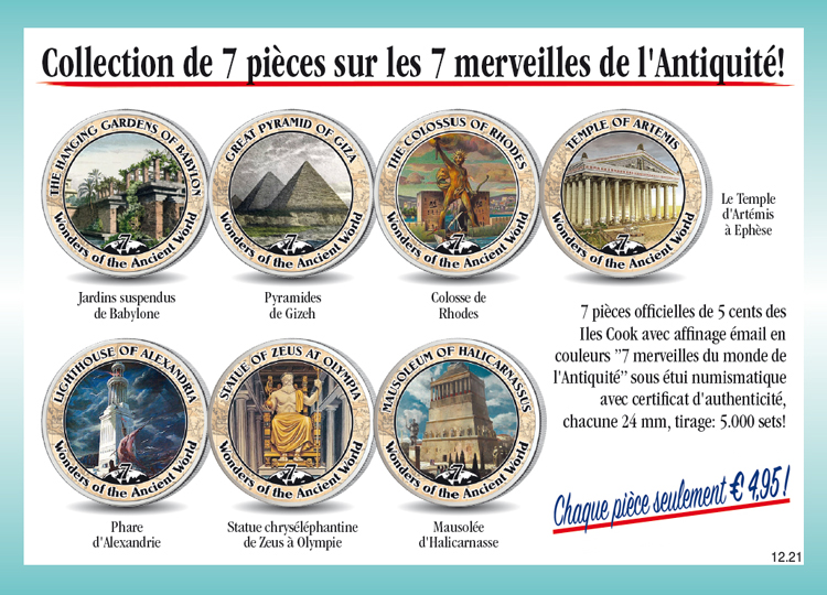 Panier Vous n'avez pas encore d'article dans votre panier. La collection de 7 pièces „Les 7 merveilles de l'Antiquité“ sous étui! Procurez-vous dès aujourd'hui la collection de 7 pièces „Les 7 merveilles de l'Antiquité“ sous étui, composée de 7 pièces officielles de 5 cents des Iles Cook avec affinage émail en couleurs et certificat d'authenticité inclus, au prix spécial de seulement € 34,65 au total! A chaque livraison, vous disposez d'un droit de restitution de 15 jours! 34,65 € TVA légale incluse Quantité: Participation aux frais d'envoi en sus (port, emballage, assurance) Ce produit ne peut être commandé que 5 fois par client. En cas de question, contactez notre service clientèle.