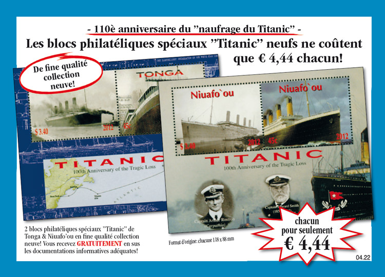 Panier Vous n'avez pas encore d'article dans votre panier. Le bloc philatélique spécial neuf „Titanic“ des Tonga! Procurez-vous dès aujourd'hui le bloc philatélique spécial neuf „Titanic“ des Tonga comprenant un texte documentaire et un étui de protection au prix spécial de seulement € 4,44 et, à rythme mensuel, des nouvelles émissions de cette série, à l'examen et sans obligation d'achat. Vous disposez à chaque livraison d'un droit de restitution de 15 jours! 4,44 € TVA légale incluse Quantité: Participation aux frais d'envoi en sus (port, emballage, assurance) Ce produit ne peut être commandé que 5 fois par client. En cas de question, contactez notre service clientèle. La bloc philatélique spécial neuf „Titanic“ de Niuafo'ou! Procurez-vous dès aujourd'hui le bloc philatélique spécial neuf „Titanic“ de Niuafo'ou comprenant un texte documentaire et un étui de protection au prix spécial de seulement € 4,44 et, à rythme mensuel, des nouvelles émissions de cette série, à l'examen et sans obligation d'achat. Vous disposez à chaque livraison d'un droit de restitution de 15 jours! 4,44 € TVA légale incluse Quantité: Participation aux frais d'envoi en sus (port, emballage, assurance) Ce produit ne peut être commandé que 5 fois par client. En cas de question, contactez notre service clientèle.