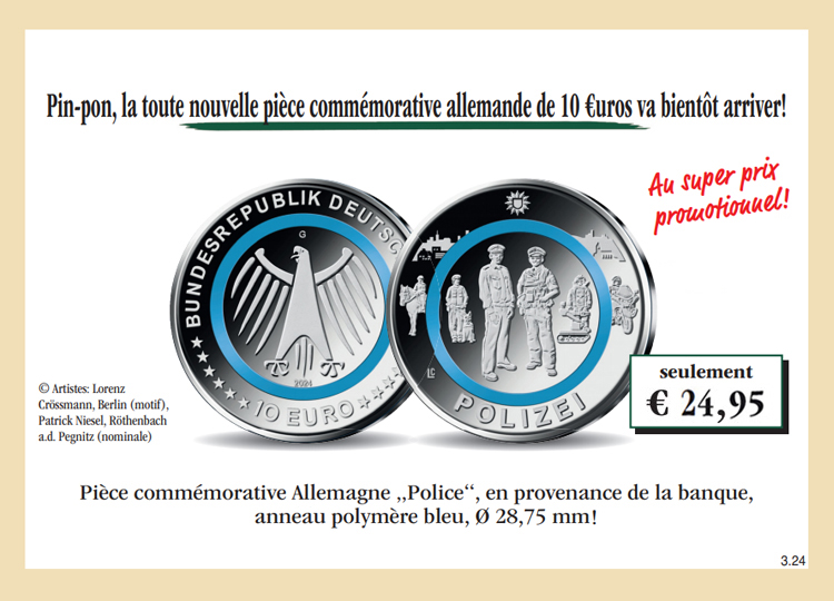 Panier Vous n'avez pas encore d'article dans votre panier. La pièce commémorative de 10 euros Allemagne „Police“ 2024 avec anneau polymère bleu! Procurez-vous dès aujourd'hui la pièce commémorative de 10 euros Allemagne „Police“ 2024 avec anneau polymère bleu translucide au prix spécial de seulement € 24,95 et recevez à rythme mensuel une autre émission de cette collection à l'examen et sans obligation d'achat. Vous disposez à chaque livraison d'un droit de restitution de 15 jours! 24,95 € TVA légale incluse Quantité: Participation aux frais d'envoi en sus (port, emballage, assurance) Ce produit ne peut être commandé que 5 fois par client. En cas de question, contactez notre service clientèle.
