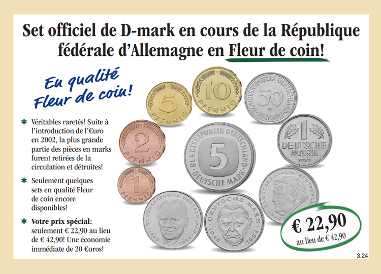 Panier Vous n'avez pas encore d'article dans votre panier. Le set en cours officiel de D-marks de la République fédérale d'Allemagne en Fleur de coin! Procurez-vous dès aujourd'hui le set en cours officiel de D-mark de la République fédérale d'Allemagne en Fleur de coin (10 pièces: de 1 pfennig à 5 marks, dont 3 pièces de 2 marks différentes) au prix spécial de seulement € 22,90 au lieu de € 42,90 et recevez à rythme mensuel une autre émission de la même collection à l'examen et sans obligation d'achat. A chaque livraison vous disposez d'un droit de restitution de 15 jours! au lieu de 42,90 € 22,90 € TVA légale incluse Quantité: Participation aux frais d'envoi en sus (port, emballage, assurance) Ce produit ne peut être commandé que 5 fois par client. En cas de question, contactez notre service clientèle.