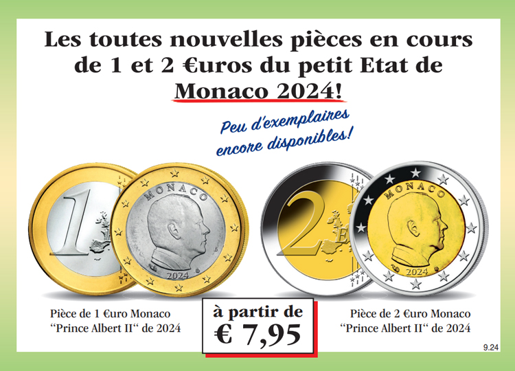 Panier Vous n'avez pas encore d'article dans votre panier. La pièce de 1 euro du petit Etat de Monaco 2024 „Prince Albert II“! Procurez-vous dès aujourd'hui la pièce de 1 euro du petit Etat de Monaco 2024 „Prince Albert II“ en qualité collection neuve au prix spécial de seulement € 7,95 et recevez à rythme mensuel une autre émission de cette collection à l'examen et sans obligation d'achat. A chaque livraison vous disposez d'un droit de restitution de 15 jours! 7,95 € TVA légale incluse Quantité: Participation aux frais d'envoi en sus (port, emballage, assurance) Ce produit ne peut être commandé que 5 fois par client. En cas de question, contactez notre service clientèle. La pièce de 2 euros du petit Etat de Monaco 2024 „Prince Albert II“! Procurez-vous dès aujourd'hui la pièce de 2 euros du petit Etat de Monaco 2024 „Prince Albert II“ en qualité collection neuve au prix spécial de seulement € 9,90 et recevez à rythme mensuel d'autres émissions de cette collection à l'examen et sans obligation d'achat. A chaque livraison vous disposez d'un droit de restitution de 15 jours! 9,90 € TVA légale incluse Quantité: Participation aux frais d'envoi en sus (port, emballage, assurance) Ce produit ne peut être commandé que 5 fois par client. En cas de question, contactez notre service clientèle.