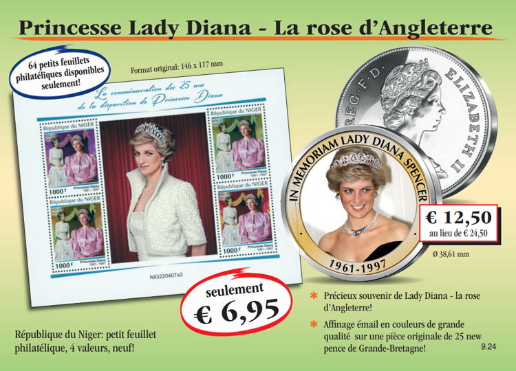 Panier Vous n'avez pas encore d'article dans votre panier. Le petit feuillet philatélique „Princesse Lady Diana – La Rose d'Angleterre“, neuf! Procurez-vous dès aujourd'hui le petit feuillet philatélique „Princesse Lady Diana – La Rose d'Angleterre“ neuf, avec inclus un texte informatif et une pochette philatélique de protection au prix spécial de seulement € 6,95 et recevez à rythme mensuel d'autres émissions de cette collection à l'examen et sans obligation d'achat. A chaque livraison vous disposez d'un droit de restitution de 15 jours! 6,95 € TVA légale incluse Quantité: Participation aux frais d'envoi en sus (port, emballage, assurance) Ce produit ne peut être commandé que 5 fois par client. En cas de question, contactez notre service clientèle. La pièce originale de 25 new pence de Grande-Bretagne avec affinage émail en couleurs „Princesse Lady Diana – La Rose d'Angleterre“! Procurez-vous dès aujourd'hui la pièce originale de 25 new pence de Grande-Bretagne avec affinage émail en couleurs „Princesse Lady Diana – La Rose d'Angleterre“ au prix spécial de seulement € 12,50 au lieu de € 24,50 et recevez à rythme mensuel une autre émission de cette collection à l'examen et sans obligation d'achat. A chaque livraison vous disposez d'un droit de restitution de 15 jours! au lieu de 24,50 € 12,50 € TVA légale incluse Quantité: Participation aux frais d'envoi en sus (port, emballage, assurance) Ce produit ne peut être commandé que 5 fois par client. En cas de question, contactez notre service clientèle.