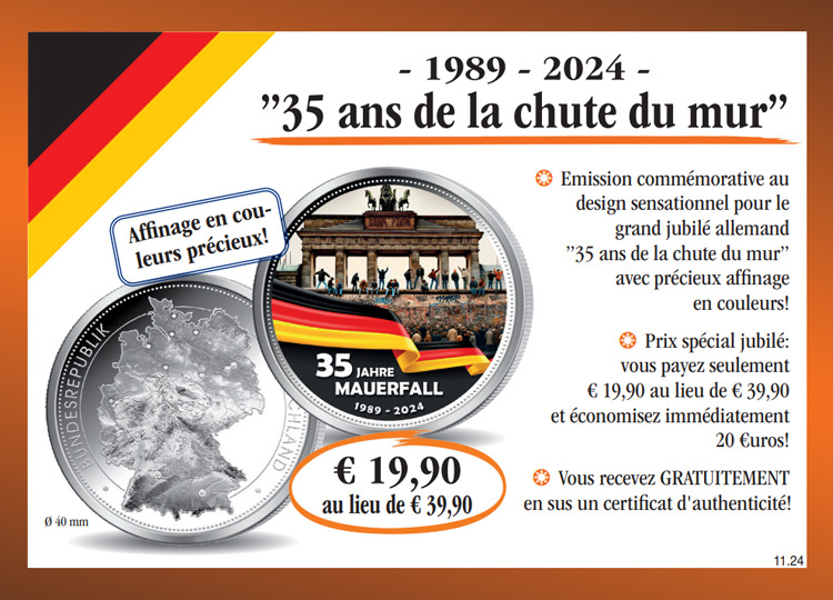 Panier Vous n'avez pas encore d'article dans votre panier. L'émission commémorative pour le grand jubilé allemand „35 ans de la chute du mur“ avec affinage en couleurs précieux! Procurez-vous dès aujourd'hui l'émission commémorative pour le grand jubilé allemand „35 ans de la chute du mur“ avec affinage en couleurs précieux au prix spécial de seulement € 19,90 au lieu de € 39,90. A chaque livraison, vous disposez d'un droit de restitution de 15 jours! au lieu de 39,90 € 19,90 € TVA légale incluse Quantité: Participation aux frais d'envoi en sus (port, emballage, assurance) Ce produit ne peut être commandé que 5 fois par client. En cas de question, contactez notre service clientèle.