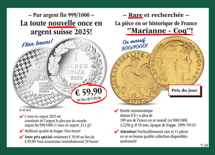 Panier Vous n'avez pas encore d'article dans votre panier. L'once Suisse 2025 en argent fin 999/1000 et en Flan bruni! Procurez-vous dès aujourd'hui l'once Suisse 2025 en argent fin 999/1000 et en Flan bruni au prix spécial de seulement € 59,90 au lieu de € 89,90 et recevez à rythme mensuel une autre émission de cette collection à l'examen et sans obligation d'achat. A chaque livraison, vous disposez d'un droit de restitution de 15 jours! au lieu de 89,90 € 59,90 € TVA légale incluse Quantité: Participation aux frais d'envoi en sus (port, emballage, assurance) Ce produit ne peut être commandé que 5 fois par client. En cas de question, contactez notre service clientèle. La pièce historique en or de France „Marianne – Coq“! Procurez-vous dès aujourd'hui la pièce historique en or de France „Marianne – Coq“ (10 francs, or 900/1000, 3,2258 g, 19 mm, période de frappe: 1899-1914, nous choisissons le millésime!) au prix du jour de seulement € 440,- et recevez à rythme mensuel une autre émission de cette collection à l'examen et sans obligation d'achat. A chaque livraison, vous disposez d'un droit de restitution de 15 jours! 440,00 € TVA légale incluse Quantité: Participation aux frais d'envoi en sus (port, emballage, assurance) Ce produit ne peut être commandé que 3 fois par client. En cas de question, contactez notre service clientèle.