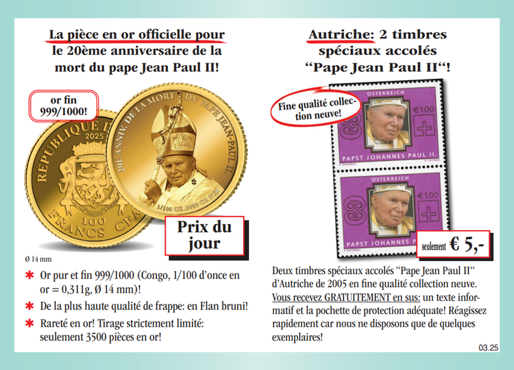 Panier Vous n'avez pas encore d'article dans votre panier. La pièce en or officielle pour le 20ème anniversaire de la mort du pape Jean Paul II! Procurez-vous dès aujourd'hui la pièce en or officielle pour le 20ème anniversaire de la mort du pape Jean Paul II (or fin 999/1000, Flan bruni, 14 mm. 0,311 g, République du Congo) au prix spécial de seulement € 69,90 au lieu de € 99,90 et, à rythme mensuel, une nouvelle émission de cette collection à l'examen, sans obligation d'achat. Vous disposez à chaque livraison d'un droit de restitution de 15 jours! au lieu de 99,90 € 69,90 € TVA légale incluse Quantité: Participation aux frais d'envoi en sus (port, emballage, assurance) Ce produit ne peut être commandé que 5 fois par client. En cas de question, contactez notre service clientèle. Les deux timbres spéciaux se tenant „Pape Jean Paul II“ d'Autriche! Procurez-vous dès aujourd'hui les deux timbres spéciaux se tenant neufs „Pape Jean Paul II“ d'Auteriche au prix de un euro chacun, avec texte informatif et étuis de protection philatéliques, au prix spécial de seulement € 5,- et, à rythme mensuel, des nouvelles émissions de cette collection à l'examen, sans obligation d'achat. Vous disposez à chaque livraison d'un droit de restitution de 15 jours! 5,00 € TVA légale incluse Quantité: Participation aux frais d'envoi en sus (port, emballage, assurance) Ce produit ne peut être commandé que 5 fois par client. En cas de question, contactez notre service clientèle.