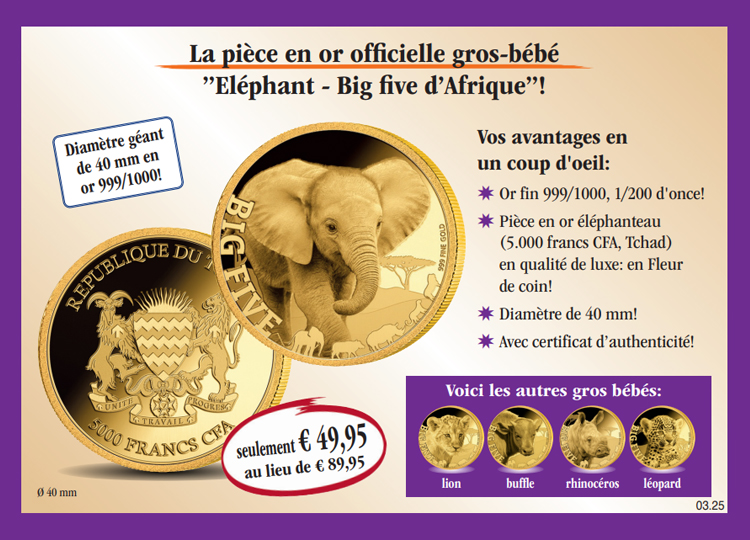 Panier Vous n'avez pas encore d'article dans votre panier. La pièce en or officielle gros bébé „Eléphant – Big Five d'Afrique“! Procurez-vous dès aujourd'hui la pièce en or officielle gros bébé „Eléphant – Big Five d'Afrique“ (5.000 francs CFA, or fin 999/1000, 1/200 d'once, 40 mm, République du Tchad) au prix spécial de seulement € 49,95 au lieu de € 89,95 et recevez à rythme mensuel une autre émission de cette collection à l'examen et sans obligation d'achat. A chaque livraison, vous disposez d'un droit de restitution de 15 jours! au lieu de 89,95 € 49,95 € TVA légale incluse Quantité: Participation aux frais d'envoi en sus (port, emballage, assurance) Ce produit ne peut être commandé que 5 fois par client. En cas de question, contactez notre service clientèle.