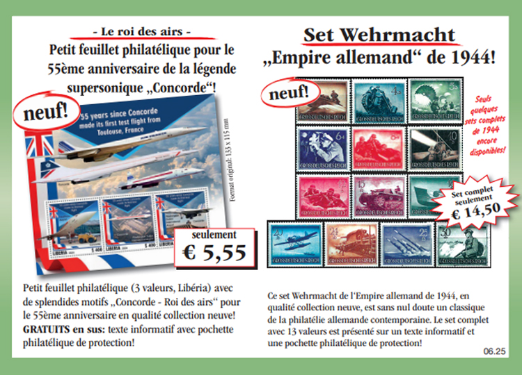 Panier Vous n'avez pas encore d'article dans votre panier. Le petit feuillet philatélique neuf pour le 55ème anniversaire de la légende supersonique „Concorde“! Procurez-vous dès aujourd'hui le petit feuillet philatélique neuf du Libéria pour le 55ème anniversaire de la légende supersonique „Concorde“ avec texte informatif et étui de protection philatélique au prix spécial de seulement € 5,55 et à rythme mensuel des nouvelles émissions de cette collection à l'examen et sans obligation d'achat. Vous disposez à chaque livraison d'un droit de restitution de 15 jours! 5,55 € TVA légale incluse Quantité: Participation aux frais d'envoi en sus (port, emballage, assurance) Ce produit ne peut être commandé que 5 fois par client. En cas de question, contactez notre service clientèle. Le set rare de la Wehrmacht „Empire allemand“ de 1944! Procurez-vous dès aujourd'hui le set rare de la Wehrmacht „Empire allemand“ neuf au prix spécial de seulement € 14,50 et à rythme mensuel des nouvelles émissions de cette collection à l'examen et sans obligation d'achat. Vous disposez à chaque livraison d'un droit de restitution de 15 jours! 14,50 € TVA légale incluse Quantité: Participation aux frais d'envoi en sus (port, emballage, assurance) Ce produit ne peut être commandé que 5 fois par client. En cas de question, contactez notre service clientèle.