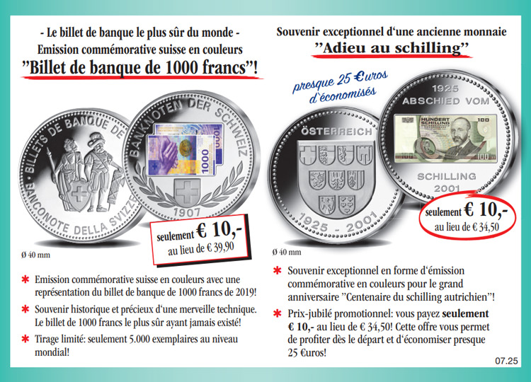 Panier Vous n'avez pas encore d'article dans votre panier. L'émission commémorative suisse en couleurs „Billet de banque de 1000 francs“! Procurez-vous dès aujourd'hui l'émission commémorative suisse en couleurs „Billet de banque de 1000 francs“ avec une reproduction de la coupure de 1000 francs de 2019 au prix spécial de seulement € 10,- au lieu de € 39,90 et recevez à rythme mensuel une autre émission de cette collection à l'examen et sans obligation d'achat. A chaque livraison, vous disposez d'un droit de restitution de 15 jours! au lieu de 39,90 € 10,00 € TVA légale incluse Quantité: Participation aux frais d'envoi en sus (port, emballage, assurance) Ce produit ne peut être commandé que 5 fois par client. En cas de question, contactez notre service clientèle. L'émission commémorative en couleurs „Autriche – Centenaire du schilling“! Procurez-vous dès aujourd'hui l' émission commémorative en couleurs „Autriche – Centenaire du schilling“ au prix spécial de seulement € 10,- au lieu de € 34,50 et recevez à rythme mensuel une autre émission de cette collection à l'examen et sans obligation d'achat. A chaque livraison, vous disposez d'un droit de restitution de 15 jours! au lieu de 34,50 € 10,00 € TVA légale incluse Quantité: Participation aux frais d'envoi en sus (port, emballage, assurance) Ce produit ne peut être commandé que 5 fois par client. En cas de question, contactez notre service clientèle.
