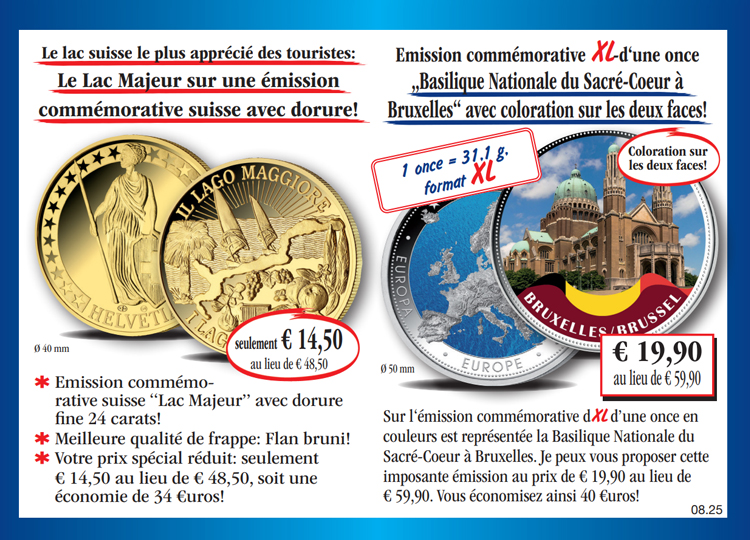 Panier Vous n'avez pas encore d'article dans votre panier. L'émission commémorative suisse dorée „Lac Majeur“! Procurez-vous dès aujourd'hui l'émission commémorative suisse „Lac Majeur“ avec dorure fine 24 carats au prix spécial de seulement € 14,50 au lieu de € 48,50 et, à rythme mensuel, une nouvelle émission de cette collection, à l'examen et sans obligation d'achat. Vous disposez à chaque livraison d'un droit de restitution de 15 jours! au lieu de 48,50 € 14,50 € TVA légale incluse Quantité: Participation aux frais d'envoi en sus (port, emballage, assurance) Ce produit ne peut être commandé que 5 fois par client. En cas de question, contactez notre service clientèle. L'imposante émission commémorative XL d'une once „Basilique du Sacré-Coeur à Bruxelles“ avec coloration sur les deux faces! Procurez-vous dès aujourd'hui l'imposante émission commémorative XL d'une once „Basilique du Sacré-Coeur à Bruxelles" avec coloration sur les deux faces au prix spécial de seulement € 19,90 au lieu de € 59,90 et, à rythme mensuel, une nouvelle émission de cette collection, à l'examen et sans obligation d'achat. Vous disposez à chaque livraison d'un droit de restitution de 15 jours! au lieu de 59,90 € 19,90 € TVA légale incluse Quantité: Participation aux frais d'envoi en sus (port, emballage, assurance) Ce produit ne peut être commandé que 5 fois par client. En cas de question, contactez notre service clientèle.