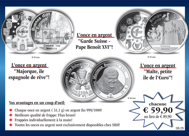Panier Vous n'avez pas encore d'article dans votre panier. L'once en argent „Majorque, île espagnole de rêve“ en Flan bruni! Procurez-vous dès aujourd'hui l'once en argent „Majorque, île espagnole de rêve“ en Flan bruni, la meilleure qualité de frappe (argent fin 999/1000, 31,1 g, 40 mm) au prix spécial de seulement € 59,90 au lieu de € 89,90 et, à rythme mensuel, une nouvelle émission de cette collection à l'examen et sans obligation d'achat. Vous disposez à chaque livraison d'un droit de restitution de 15 jours! au lieu de 89,90 € 59,90 € TVA légale incluse Quantité: Participation aux frais d'envoi en sus (port, emballage, assurance) Ce produit ne peut être commandé que 1 fois par client. En cas de question, contactez notre service clientèle. L'once en argent „Garde suisse – Pape Benoît XVI“ en Flan bruni! Procurez-vous dès aujourd'hui l'once en argent „Garde suissse -pape Benoît XVI“ en Flan bruni, la meilleure qualité de frappe (argent fin 999/1000, 31,1 g, 40 mm) au prix spécial de seulement € 59,90 au lieu de € 89,90 et, à rythme mensuel, une nouvelle émission de cette collection à l'examen et sans obligation d'achat. Vous disposez à chaque livraison d'un droit de restitution de 15 jours au lieu de 89,90 € 59,90 € TVA légale incluse Quantité: Participation aux frais d'envoi en sus (port, emballage, assurance) Ce produit ne peut être commandé que 1 fois par client. En cas de question, contactez notre service clientèle. L'once en argent „Malte – petite île de l'euro“ en Flan bruni! Procurez-vous dès aujourd'hui l'once en argent „Malte- petite île de l'euro“ en Flan bruni, la meilleure qualité de frappe (argent fin 999/1000, 31,1 g, 40 mm) au prix spécial de seulement € 59,90 au lieu de € 89,90 et, à rythme mensuel, une nouvelle émission de cette collection à l'examen et sans obligation d'achat. Vous disposez à chaque livraison d'un droit de restitution de 15 jours! au lieu de 89,90 € 59,90 € TVA légale incluse Quantité: Participation aux frais d'envoi en sus (port, emballage, assurance) Ce produit ne peut être commandé que 1 fois par client. En cas de question, contactez notre service clientèle.