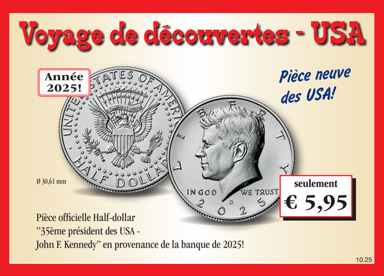 Panier Vous n'avez pas encore d'article dans votre panier. Le set des USA „Innovation - Dollar“ de 2025! Procurez-vous dès aujourd'hui le set des USA de l'année 2025 „Innovation - Dollar“, comprenant 4 pièces au total avec étui numismatique inclus,au prix spécial de seulement € 17,50 et recevez à rythme mensuel une autre émission de cette collection à l'examen et sans obligation d'achat. A chaque envoi, vous disposez d'un droit de restitution de 15 jours! 17,50 € TVA légale incluse Quantité: Participation aux frais d'envoi en sus (port, emballage, assurance) Ce produit ne peut être commandé que 5 fois par client. En cas de question, contactez notre service clientèle. Les dernières pièces de 1 cent de 2025 des USA! Procurez-vous dès aujourd'hui les dernières pièces de 1 cent de 2025 des USA, soit deux pièces de 1 cent (ateliers de frappe: Denver et Philadelphie) en qualité collection neuve avec étui numismatique inclus, au prix spécial de seulement € 7,95 et recevez à rythme mensuel une autre émission de cette collection à l'examen et sans obligation d'achat. A chaque envoi, vous disposez d'un droit de restitution de 15 jours! 7,95 € TVA légale incluse Quantité: Participation aux frais d'envoi en sus (port, emballage, assurance) Ce produit ne peut être commandé que 5 fois par client. En cas de question, contactez notre service clientèle. Cela pourrait aussi vous intéresser!