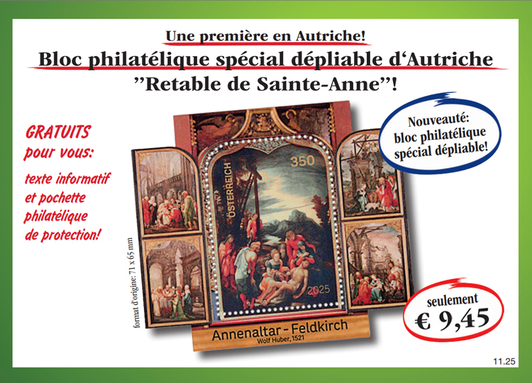 Panier Vous n'avez pas encore d'article dans votre panier. Le bloc philatélique spécial dépliable „Retable de Sainte-Anne“ d'Autriche! Procurez-vous dès aujourd'hui le bloc philatélique spécial dépliable „Retable de Sainte-Anne“ d'Autriche en fine qualité collection neuve au prix spécial de seulement € 9,45 et recevez à rythme mensuel une autre émission de cette collection à l'examen et sans obligation d'achat. A chaque livraison, vous disposez d'un droit de restitution de 15 jours! 9,45 € TVA légale incluse Quantité: Participation aux frais d'envoi en sus (port, emballage, assurance) Ce produit ne peut être commandé que 5 fois par client. En cas de question, contactez notre service clientèle. Cela pourrait aussi vous intéresser!