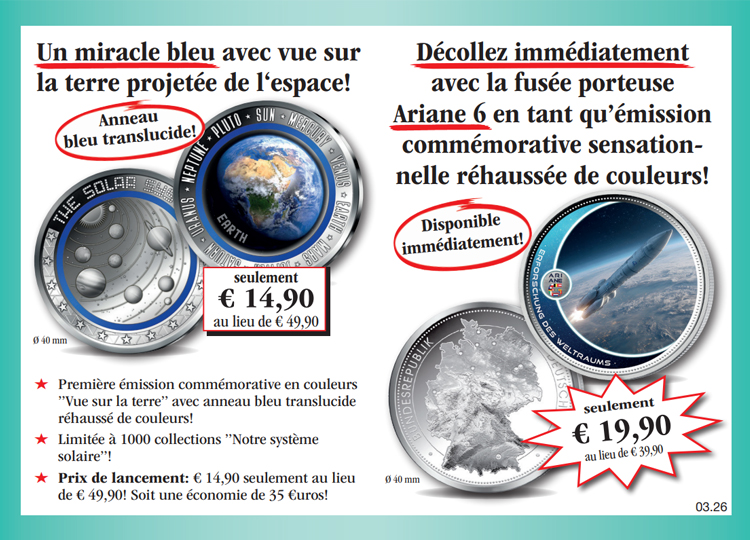 Panier Vous n'avez pas encore d'article dans votre panier. L'émission commémorative „Vue sur la terre“ avec anneau translucide bleu! Procurez-vous dès aujourd'hui la première émission commémorative „Vue sur la terre“ avec anneau translucide bleu au prix spécial de seulement € 14,90 au lieu de € 49,90 et, à rythme mensuel, une nouvelle émission de cette collection à l'examen et sans obligation d'achat. Vous disposez à chaque livraison d'un droit de restitution de 15 jours! au lieu de 49,90 € 14,90 € TVA légale incluse Quantité: Participation aux frais d'envoi en sus (port, emballage, assurance) Ce produit ne peut être commandé que 5 fois par client. En cas de question, contactez notre service clientèle. La première émission commémorative allemande „Fusée porteuse Ariane 6“ en couleurs! Procurez-vous dès aujourd'hui l'émission commémorative allemande „Fusée porteuse Ariane 6“ en couleurs au prix spécial de seulement € 19,90 au lieu de € 39,90 et, à rythme mensuel, une nouvelle émission de cette collection à l'examen et sans obligation d'achat. Vous disposez à chaque livraison d'un droit de restitution de 15 jours! au lieu de 39,90 € 19,90 € TVA légale incluse Quantité: Participation aux frais d'envoi en sus (port, emballage, assurance) Ce produit ne peut être commandé que 5 fois par client. En cas de question, contactez notre service clientèle. Cela pourrait aussi vous intéresser!