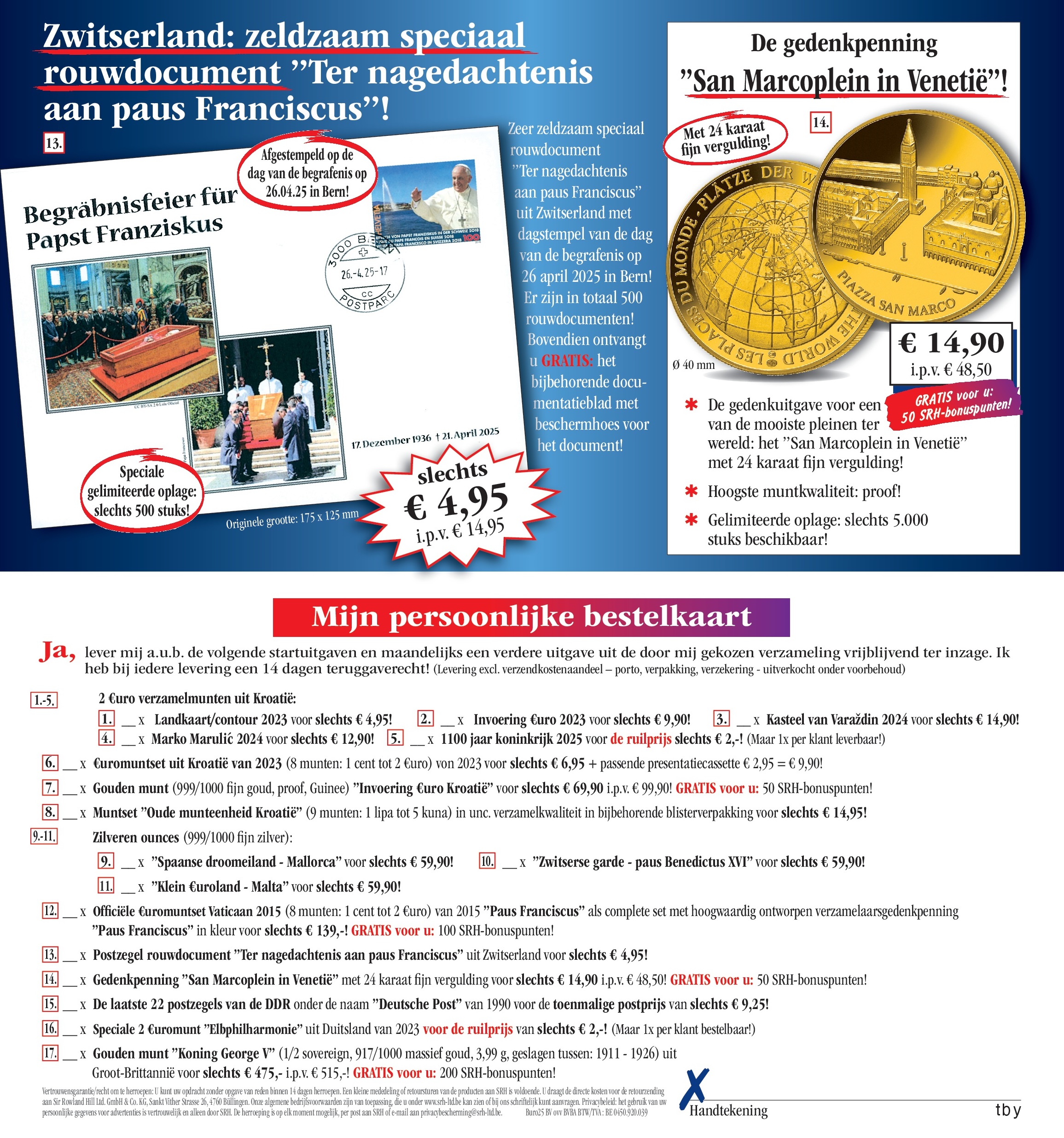 Vertrouwensgarantie/recht om te herroepen: U kunt uw opdracht zonder opgave van reden binnen 14 dagen herroepen. Een kleine mededeling of retoursturen van de producten aan SRH is voldoende. U draagt de directe kosten voor de retourzending aan Sir Rowland Hill Ltd. GmbH & Co. KG, Sankt Vither Strasse 26, 4760 Büllingen. Onze algemene bedrijfsvoorwaarden zijn van toepassing, die u onder www.srh-ltd.be kan zien of bij ons schriftelijk kunt aanvragen. Privacybeleid: het gebruik van uw persoonlijke gegevens voor advertenties is vertrouwelijk en alleen door SRH. De herroeping is op elk moment mogelijk, per post aan SRH of e-mail aan privacybescherming@srh-ltd.be. Buro25 BV ovv BVBA BTW/TVA : BE 0450.920.039