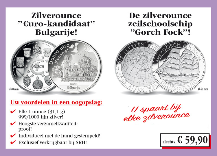 Winkelwagen U heeft nog geen artikelen in uw winkelwagen. De zilverounce „Euro-kandidaat“ Bulgarije in proof! Verzekert u zich vandaag nog van de zilverounce „Euro-kandidaat“ Bulgarije in de hoogste muntkwaliteit proof (999/1000 fijn zilver, 31,1 g, 40 mm) voor de speciale prijs van slechts € 59,90 en maandelijks een verdere uitgave uit deze verzameling vrijblijvend en zonder koopverplichting ter inzage. U heeft bij iedere levering een 14 dagen teruggaverecht! 59,90 € incl. wettelijke BTW Aantal: Excl. aandelige verzendkosten Dit artikel kan slechts 1 keer per klant besteld worden. Bij vragen graag contact opnemen met onze klantenservice. De zilverounce zeilschoolschip „Gorch Fock“ in proof! Verzekert u zich vandaag nog van de zilverounce zeilschoolschip „Gorch Fock“ in de hoogste muntkwaliteit proof (999/1000 fijn zilver, 31,1 g, 40 mm) voor de speciale prijs van slechts € 59,90 en maandelijks een verdere uitgave uit deze verzameling vrijblijvend en zonder koopverplichting ter inzage. U heeft bij iedere levering een 14 dagen teruggaverecht! 59,90 € incl. wettelijke BTW Aantal: Excl. aandelige verzendkosten Dit artikel kan slechts 1 keer per klant besteld worden. Bij vragen graag contact opnemen met onze klantenservice.