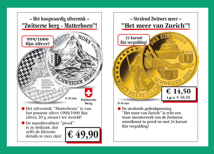 Winkelwagen U heeft nog geen artikelen in uw winkelwagen. Het zilverstuk „Zwitserse berg – Matterhorn“! Verzekert u zich vandaag nog van het zilverstuk „Zwitserse berg – Matterhorn“ (999/1000 fijn zilver, 20 g zwaar, proof) voor de speciale prijs van slechts € 49,90 en maandelijks een verdere uitgave uit deze verzameling vrijblijvend en zonder koopverplichting ter inzage. U heeft bij iedere levering een 14 dagen teruggaverecht! 49,90 € incl. wettelijke BTW Aantal: Excl. aandelige verzendkosten Dit artikel kan slechts 1 keer per klant besteld worden. Bij vragen graag contact opnemen met onze klantenservice. De vergulde gedenkpenning „Zwitserse meren – het meer van Zurich“! Verzekert u zich vandaag nog van de met 24 karaat fijn vergulding veredelde gedenkpenning „Zwitserse meren – het meer van Zurich“ voor de speciale prijs van slechts € 14,50 i.p.v. € 48,50 en maandelijks een verdere uitgave uit deze verzameling vrijblijvend en zonder koopverplichting ter inzage. U heeft bij iedere levering een 14 dagen teruggaverecht! in plaats van (i.p.v.) 48,50 € 14,50 € incl. wettelijke BTW Aantal: Excl. aandelige verzendkosten Dit artikel kan slechts 5 keer per klant besteld worden. Bij vragen graag contact opnemen met onze klantenservice.