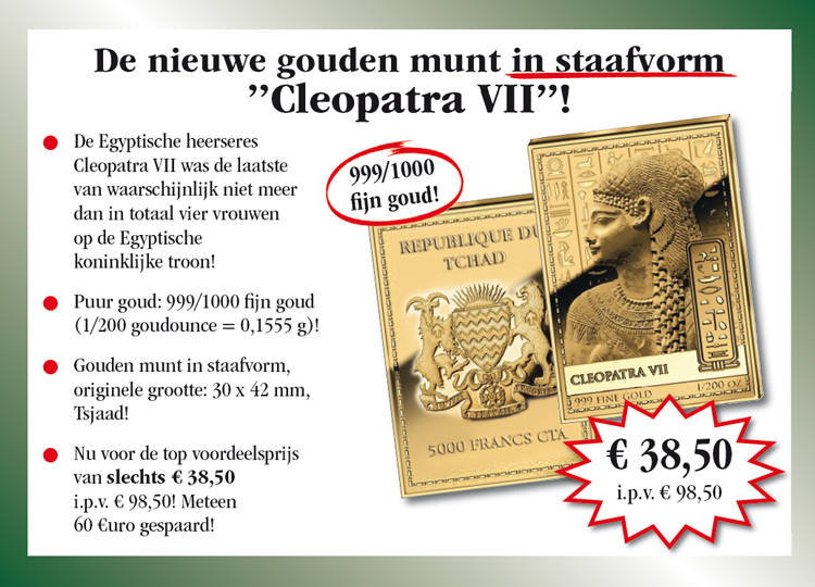 Winkelwagen U heeft nog geen artikelen in uw winkelwagen. De zeldzame gouden munt in staafvorm „Cleopatra VII“! Verzekert u zich vandaag nog van de zeldzame gouden munt in staafvorm „Cleopatra VII“ (999/1000 fijn goud, proof, 30 x 42 mm, 1/200 ounce = 0,1555 g, Tsjaad) voor de speciale prijs van slechts € 38,50 i.p.v. € 98,50 en maandelijks een verdere uitgave uit deze verzameling vrijblijvend en zonder koopverplichting ter inzage. U heeft bij iedere levering een 14 dagen teruggaverecht! in plaats van (i.p.v.) 98,50 € 38,50 € incl. wettelijke BTW Aantal: Excl. aandelige verzendkosten Dit artikel kan slechts 5 keer per klant besteld worden. Bij vragen graag contact opnemen met onze klantenservice.