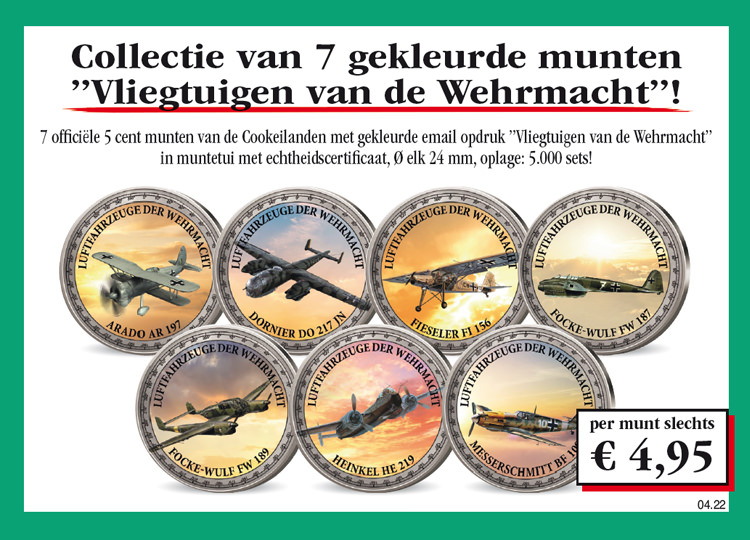Winkelwagen U heeft nog geen artikelen in uw winkelwagen. Collectie van 7 gekleurde munten „Vliegtuigen van de Wehrmacht“! Verzekert u zich vandaag nog van de collectie van 7 gekleurde munten „Vliegtuigen van de Wehrmacht“ in etui, bestaande uit 7 officiële 5 cent munten van de Cookeilanden met gekleurde email opdruk en inclusief echtsheidscertificaat, voor de speciale prijs van totaal slechts € 34,65! U heeft bij iedere levering een 14 dagen teruggaverecht! 34,65 € incl. wettelijke BTW Aantal: Excl. aandelige verzendkosten Dit artikel kan slechts 5 keer per klant besteld worden. Bij vragen graag contact opnemen met onze klantenservice.