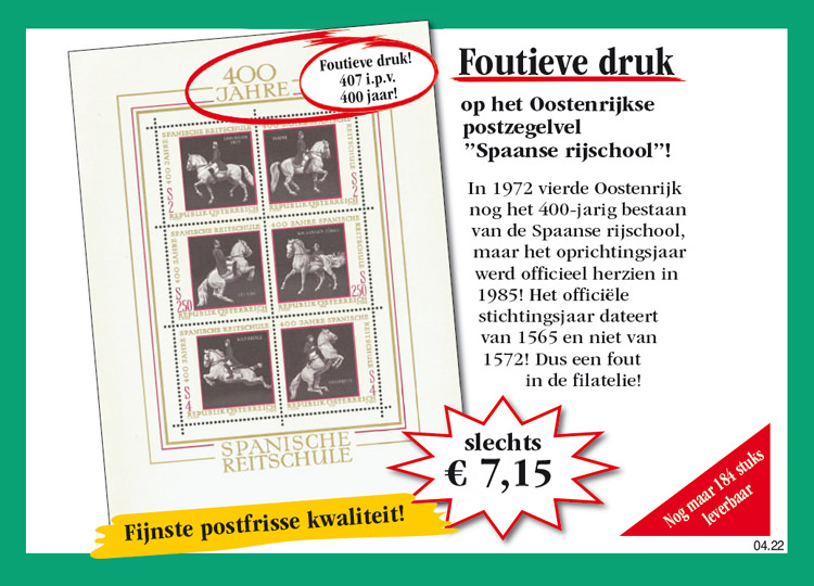 Winkelwagen U heeft nog geen artikelen in uw winkelwagen. Foutieve druk op het Oostenrijkse postzegelvel „Spaanse rijschool“! Verzekert u zich vandaag nog van de foutieve druk op het Oostenrijkse postzegelvel „Spaanse rijschool“, inclusief informatief tekstblad en beschermhoesje, voor de speciale prijs van slechts € 7,15 en maandelijks een verdere uitgave uit deze verzameling vrijblijvend en zonder koopverplichting ter inzage. U heeft bij iedere levering een 14 dagen teruggaverecht! 7,15 € incl. wettelijke BTW Aantal: Excl. aandelige verzendkosten Dit artikel kan slechts 5 keer per klant besteld worden. Bij vragen graag contact opnemen met onze klantenservice. Misschien is het volgende ook interessant voor u!