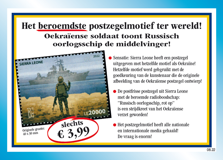 Winkelwagen U heeft nog geen artikelen in uw winkelwagen. Het beroemdste postzegelmotief ter wereld! Oekraïense soldaat toont Russisch oorlogsschip de middelvinger! Verzekert u zich vandaag nog van het beroemdste postzegelmotief ter wereld op een postfrisse postzegel uit Sierra Leone „Oekraïense soldaat toont Russisch oorlogsschip de middelvinger“ inclusief informatief tekstmateriaal en beschermhoesje voor de postzegel voor de speciale prijs van slechts € 3,99 en maandelijks verdere uitgaven uit deze verzameling vrijblijvend en zonder koopverplichting ter inzage. U heeft bij iedere levering een 14 dagen teruggaverecht! 3,99 € incl. wettelijke BTW Aantal: Excl. aandelige verzendkosten Dit artikel kan slechts 5 keer per klant besteld worden. Bij vragen graag contact opnemen met onze klantenservice.