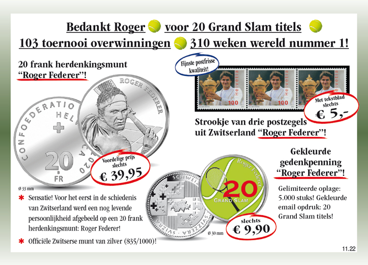 Winkelwagen U heeft nog geen artikelen in uw winkelwagen. De 20 frank herdenkingsmunt „Roger Federer“ van 835/1000 zilver! Verzekert u zich vandaag nog van de 20 frank herdenkingsmunt „Roger Federer“ van 835/1000 zilver voor de speciale prijs van slechts € 39,95 en maandelijks een verdere uitgave uit deze verzameling vrijblijvend en zonder koopverplichting ter inzage. U heeft bij iedere levering een 14 dagen teruggaverecht! 39,95 € incl. wettelijke BTW Aantal: Excl. aandelige verzendkosten Dit artikel kan slechts 5 keer per klant besteld worden. Bij vragen graag contact opnemen met onze klantenservice. Het strookje van drie postzegels uit Zwitserland „Roger Federer“! Verzekert u zich vandaag nog van het strookje van drie postzegels uit Zwitserland „Roger Federer“ in fijnste postfrisse kwaliteit, met bijbehorend tekstblad en beschermhoesje voor de postzegels voor de speciale prijs van slechts € 5,- en maandelijks een verdere uitgave uit deze verzameling vrijblijvend en zonder koopverplichting ter inzage. U heeft bij iedere levering een 14 dagen teruggaverecht! 5,00 € incl. wettelijke BTW Aantal: Excl. aandelige verzendkosten Dit artikel kan slechts 5 keer per klant besteld worden. Bij vragen graag contact opnemen met onze klantenservice. De streng gelimiteerde gedenkpenning met gekleurde email opdruk „Roger Federer“! Verzekert u zich vandaag nog van de streng gelimiteerde gedenkpenning met gekleurde email opdruk „Roger Federer“ voor de speciale prijs van slechts € 9,90 en maandelijks een verdere uitgave uit deze verzameling vrijblijvend en zonder koopverplichting ter inzage. U heeft bij iedere levering een 14 dagen teruggaverecht! 9,90 € incl. wettelijke BTW Aantal: Excl. aandelige verzendkosten Dit artikel kan slechts 5 keer per klant besteld worden. Bij vragen graag contact opnemen met onze klantenservice.