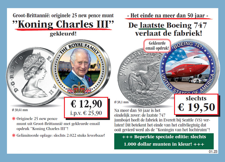 Winkelwagen U heeft nog geen artikelen in uw winkelwagen. De originele 25 new pence munt uit Groot-Brittannië met gekleurde email opdruk „Koning Charles III“! Verzekert u zich vandaag nog van de originele 25 new pence munt uit Groot-Brittannië met gekleurde email opdruk „Koning Charles III“ voor de speciale prijs van slechts € 12,90 i.p.v. € 25,90 en maandelijks een verdere uitgave uit deze verzameling vrijblijvend en zonder koopverplichting ter inzage. U heeft bij iedere levering een 14 dagen teruggaverecht! in plaats van (i.p.v.) 25,90 € 12,90 € incl. wettelijke BTW Aantal: Excl. aandelige verzendkosten Dit artikel kan slechts 5 keer per klant besteld worden. Bij vragen graag contact opnemen met onze klantenservice. De originele dollar herdenkingsmunt met gekleurde email opdruk „Boeing 747“! Verzekert u zich vandaag nog van de originele dollar herdenkingsmunt met gekleurde email opdruk „Boeing 747“ voor de speciale prijs van slechts € 19,50! U heeft bij iedere levering een 14 dagen teruggaverecht! 19,50 € incl. wettelijke BTW Aantal: Excl. aandelige verzendkosten Dit artikel kan slechts 5 keer per klant besteld worden. Bij vragen graag contact opnemen met onze klantenservice. Misschien is het volgende ook interessant voor u!