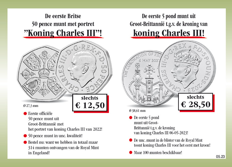 Winkelwagen U heeft nog geen artikelen in uw winkelwagen. De eerste Britse 50 pence munt met het portret van „Koning Charles III“! Verzekert u zich vandaag nog van de eerste Britse 50 pence munt met het portret van „Koning Charles III“, van 2022 en in unc. kwaliteit, voor de speciale prijs van slechts € 12,50 en maandelijks een verdere uitgave uit deze verzameling vrijblijvend en zonder koopverplichting ter inzage. U heeft bij iedere levering een 14 dagen teruggaverecht! 12,50 € incl. wettelijke BTW Aantal: Excl. aandelige verzendkosten Dit artikel kan slechts 5 keer per klant besteld worden. Bij vragen graag contact opnemen met onze klantenservice. De eerste 5 pond munt uit Groot-Brittannië t.g.v. de kroning van koning Charles III! Verzekert u zich vandaag nog van de eerste 5 pond munt uit Groot-Brittannië t.g.v. de kroning van koning Charles III, van 2023 en geleverd in de officiële blister van de Royal Mint, voor de speciale prijs van slechts € 28,50 en maandelijks een verdere uitgave uit deze verzameling vrijblijvend en zonder koopverplichting ter inzage. U heeft bij iedere levering een 14 dagen teruggaverecht! 28,50 € incl. wettelijke BTW Aantal: Excl. aandelige verzendkosten Dit artikel kan slechts 5 keer per klant besteld worden. Bij vragen graag contact opnemen met onze klantenservice.