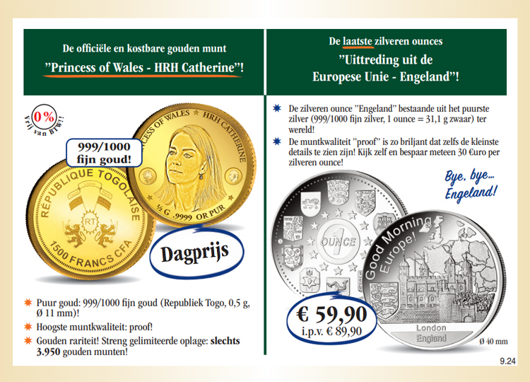 Winkelwagen U heeft nog geen artikelen in uw winkelwagen. De officiële en kostbare gouden munt „Princess of Wales – HRH Catherine“! Verzekert u zich vandaag nog van de officiële en kostbare gouden munt „Princess of Wales – HRH Catherine“ (999/1000 fijn goud, proof, 11 mm, 0,5 g, republiek Togo, gelimiteerde oplage: 3.950 stuks) voor de dagprijs van slechts € 79,90 en maandelijks een verdere uitgave uit deze verzameling vrijblijvend en zonder koopverplichting ter inzage. U heeft bij iedere levering een 14 dagen teruggaverecht! 79,90 € incl. wettelijke BTW Aantal: Excl. aandelige verzendkosten Dit artikel kan slechts 5 keer per klant besteld worden. Bij vragen graag contact opnemen met onze klantenservice. De laatste zilveren ounce „Uittreding uit de Europese Unie - Engeland“! Verzekert u zich vandaag nog van de laatste zilveren ounce „Uittreding uit de Europese Unie - Engeland“ (999/1000 fijn zilver, 31,1 g, 40 mm) voor de speciale prijs van slechts € 59,90 i.p.v. € 89,90 en maandelijks een verdere uitgave uit deze verzameling vrijblijvend en zonder koopverplichting ter inzage. U heeft bij iedere levering een 14 dagen teruggaverecht! in plaats van (i.p.v.) 89,90 € 59,90 € incl. wettelijke BTW Aantal: Excl. aandelige verzendkosten Dit artikel kan slechts 5 keer per klant besteld worden. Bij vragen graag contact opnemen met onze klantenservice.