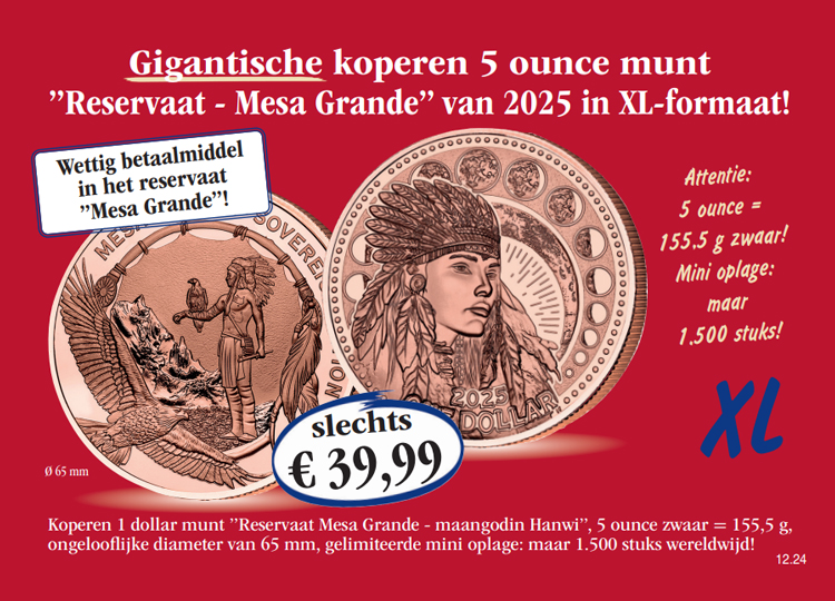 Winkelwagen U heeft nog geen artikelen in uw winkelwagen. De gigantische koperen 5 ounce munt „Reservaat – Mesa Grande“ van 2025 in XL-formaat! Verzekert u zich vandaag nog van de gigantische koperen 5 ounce munt „Reservaat – Mesa Grande“ van 2025 in XL-formaat (1 dollar, 5 ounce = 155,5 g zwaar, 65 mm, mini-oplage: slechts 1.500 stuks) voor de speciale prijs van slechts € 39,99 en maandelijks een verdere uitgave uit deze verzameling vrijblijvend en zonder koopverplichting ter inzage. U heeft bij iedere levering een 14 dagen teruggaverecht! 39,99 € incl. wettelijke BTW Aantal: Excl. aandelige verzendkosten Dit artikel kan slechts 5 keer per klant besteld worden. Bij vragen graag contact opnemen met onze klantenservice.