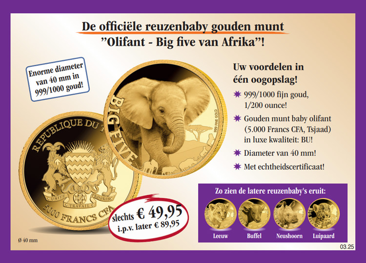 Winkelwagen U heeft nog geen artikelen in uw winkelwagen. De officiële reuzenbaby gouden munt „Olifant – Big five van Afrika“! Verzekert u zich vandaag nog van de officiële reuzenbaby gouden munt „Olifant – Big five van Afrika“ (5.000 Francs CFA, 999/1000 fijn goud, 1/200 ounce, 40 mm, republiek Tsjaad) voor de speciale prijs van slechts € 49,95 i.p.v. € 89,95 en maandelijks een verdere uitgave uit deze verzameling vrijblijvend en zonder koopverplichting ter inzage. U heeft bij iedere levering een 14 dagen teruggaverecht! in plaats van (i.p.v.) 89,95 € 49,95 € incl. wettelijke BTW Aantal: Excl. aandelige verzendkosten Dit artikel kan slechts 5 keer per klant besteld worden. Bij vragen graag contact opnemen met onze klantenservice.