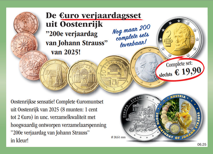 Winkelwagen U heeft nog geen artikelen in uw winkelwagen. De euro verjaardagsset uit Oostenrijk „200e verjaardag van Johann Strauss“ van 2025! Verzekert u zich vandaag nog van de euromuntset Oostenrijk van 2025 (8 munten: 1 cent tot 2 euro), inclusief de hoogwaardig ontworpen verzamelaarspenning „200e verjaardag van Johann Strauss“ in kleur en geleverd in de passende presentatiecassette, voor de speciale prijs van slechts € 19,90! Maandelijks ontvangt u een verdere uitgave uit deze verzameling vrijblijvend en zonder koopverplichting ter inzage. U heeft bij iedere levering een 14 dagen teruggaverecht! 19,90 € incl. wettelijke BTW Aantal: Excl. aandelige verzendkosten Dit artikel kan slechts 5 keer per klant besteld worden. Bij vragen graag contact opnemen met onze klantenservice.