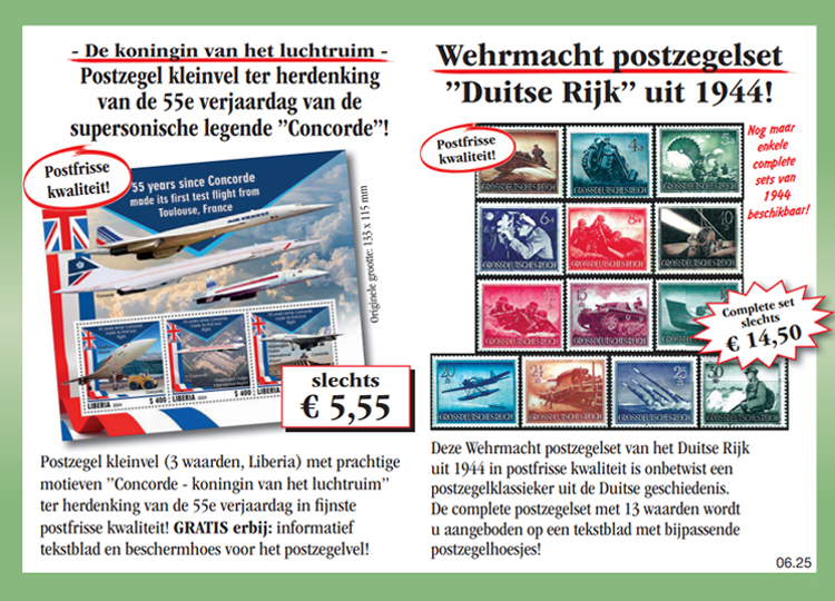 Winkelwagen U heeft nog geen artikelen in uw winkelwagen. Het postfris postzegel kleinvel ter herdenking van de 55e verjaardag van de supersonische legende „Concorde“! Verzekert u zich vandaag nog van het postfris postzegel kleinvel uit Liberia ter herdenking aan de 55e verjaardag van de supersonische legende „Concorde“ incl. informatief tekstblad en beschermhoes voor het postzegelvel voor de speciale prijs van slechts € 5,55 en maandelijks verdere uitgaven uit deze verzameling vrijblijvend en zonder koopverplichting ter inzage. U heeft bij iedere levering een 14 dagen teruggaverecht! 5,55 € incl. wettelijke BTW Aantal: Excl. aandelige verzendkosten Dit artikel kan slechts 5 keer per klant besteld worden. Bij vragen graag contact opnemen met onze klantenservice. De zeldzame Wehrmacht postzegelset „Duitse Rijk“ van 1944! Verzekert u zich vandaag nog van de zeldzame Wehrmacht postzegelset „Duitse Rijk“ van 1944 in fijnste postfrisse kwaliteit voor de speciale prijs van slechts € 14,50 en maandelijks verdere uitgaven uit deze verzameling vrijblijvend en zonder koopverplichting ter inzage. U heeft bij iedere levering een 14 dagen teruggaverecht! 14,50 € incl. wettelijke BTW Aantal: Excl. aandelige verzendkosten Dit artikel kan slechts 5 keer per klant besteld worden. Bij vragen graag contact opnemen met onze klantenservice.