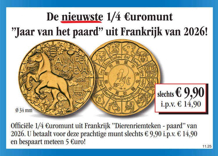 Winkelwagen U heeft nog geen artikelen in uw winkelwagen. De 1/4 euro herdenkingsmunt „Jaar van het paard” uit Frankrijk uit 2026! Bestel vandaag nog de officiële 1/4 euro herdenkingsmunt „Jaar van het paard” uit Frankrijk uit 2026 voor de speciale prijs van slechts € 9,90 in plaats van € 14,90 en ontvang maandelijks een nieuwe uitgave uit deze collectie, vrijblijvend en ter inzage. Bij elke levering heeft u 14 dagen recht op retour! in plaats van (i.p.v.) 14,90 € 9,90 € incl. wettelijke BTW Aantal: Excl. aandelige verzendkosten Dit artikel kan slechts 5 keer per klant besteld worden. Bij vragen graag contact opnemen met onze klantenservice.