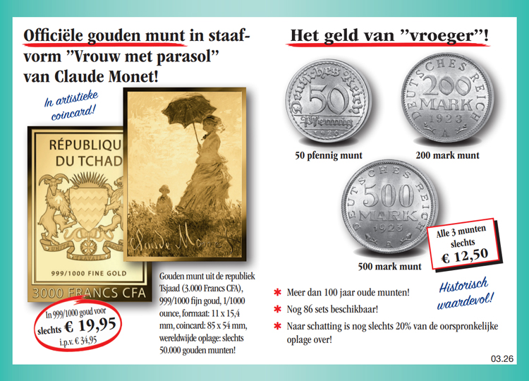 Winkelwagen U heeft nog geen artikelen in uw winkelwagen. De officiële gouden munt in staafvorm „Vrouw met parasol“ van Claude Monet! Verzeker u nog vandaag van de officiële gouden munt in staafvorm „Vrouw met parasol“ van Claude Monet (999/1000 goud, 11 x 15,4 mm, 0,0311 g, 3.000 Francs CFA, 1/1000 ounce, Tsjaad) voor de speciale prijs van slechts € 19,95 i.p.v. € 34,95 en ontvang maandelijks een verdere uitgave uit deze collectie, vrijblijvend en ter inzage. Bij elke levering heeft u 14 dagen teruggaverecht! in plaats van (i.p.v.) 34,95 € 19,95 € incl. wettelijke BTW Aantal: Excl. aandelige verzendkosten Dit artikel kan slechts 5 keer per klant besteld worden. Bij vragen graag contact opnemen met onze klantenservice. Het geld van „vroeger“ - meer dan 100 jaar oude munten uit de Weimarrepublik! Verzeker u nog vandaag van de 50 pfennig munt, de 200 mark munt en de 500 mark munt uit de Weimarrepublik (1919-1923, de jaargangen worden door ons geselecteerd) voor de speciale prijs van slechts € 12,50 in totaal en ontvang maandelijks een verdere uitgave uit deze collectie, vrijblijvend en ter inzage. Bij elke levering heeft u 14 dagen teruggaverecht! 12,50 € incl. wettelijke BTW Aantal: Excl. aandelige verzendkosten Dit artikel kan slechts 5 keer per klant besteld worden. Bij vragen graag contact opnemen met onze klantenservice. Misschien is het volgende ook interessant voor u!